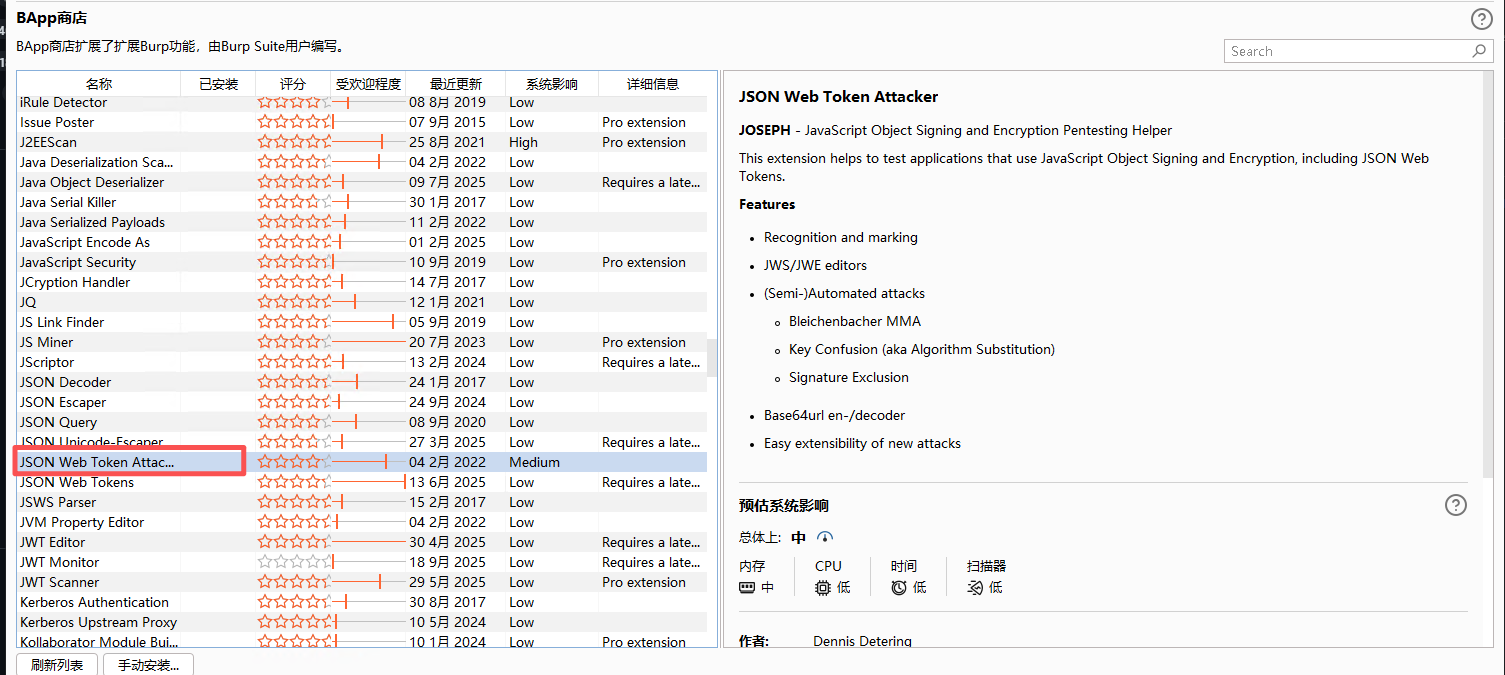 JWT一般是几种加密算法进行签名,但是有的服务端也可以接受none(空加密算法)进行加密,在burp里边有一个Json web Token Attacker插件,可以使用空加密算法,下载安装