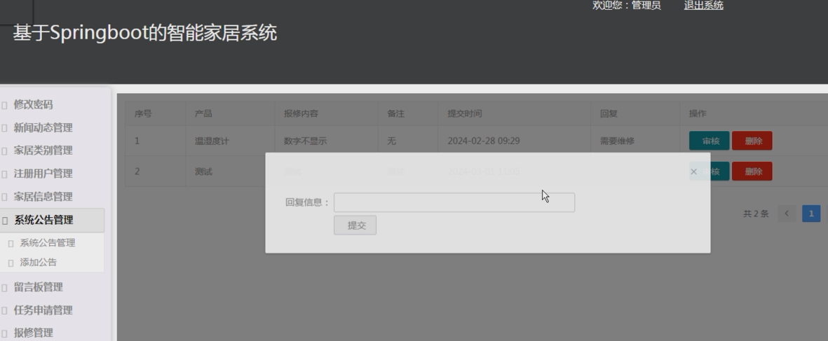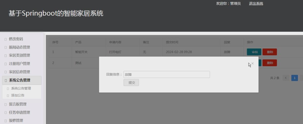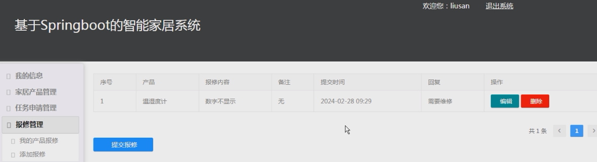 报修管理:用户可通过后台提交智能家居报修申请,包括报修产品名称及报修内容等,同时可查询报修申请的审核状态。