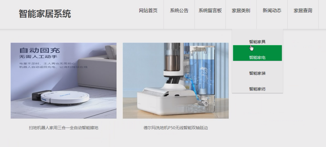 智能家居系统首页包括用户注册登录窗口、系统公告、系统留言板、家居类别、新闻动态及家居查询,用户可通过以上窗口进行注册登录、家居信息查询、查看新闻公告及在线留言,同时为了便于家居信息的查询,用户可按照家居类别选择需要查询的家居信息。