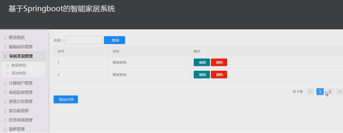 管理员用户登录进入系统后台后,可通过家居类别管理模块添加及查询家居类别信息,可结合智能家居的产品类型进行类别的新增、修改及删除操作。