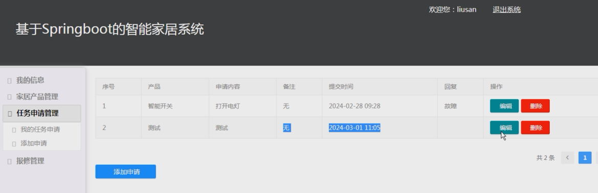 用户可通过系统后台的任务申请管理模块添加智能家居任务申请,需要用户添加产品名称、申请能容及备注信息,同时用户可通过我的任务申请查看任务详情及审批结果,也可以结合应用需求修改及删除任务信息。
