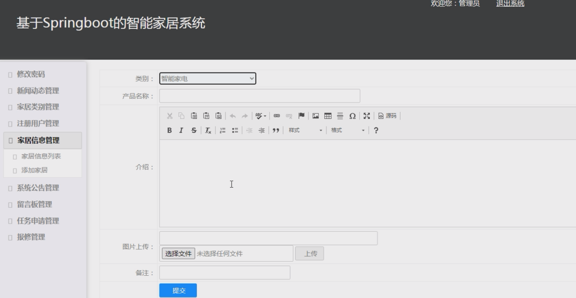 管理员用户可通过家居信息管理模块添加家居信息,包括家居类别、家居产品名称、产品介绍、图片上传及备注,通过家居信息列表可查看和管理系统内的家居产品信息。