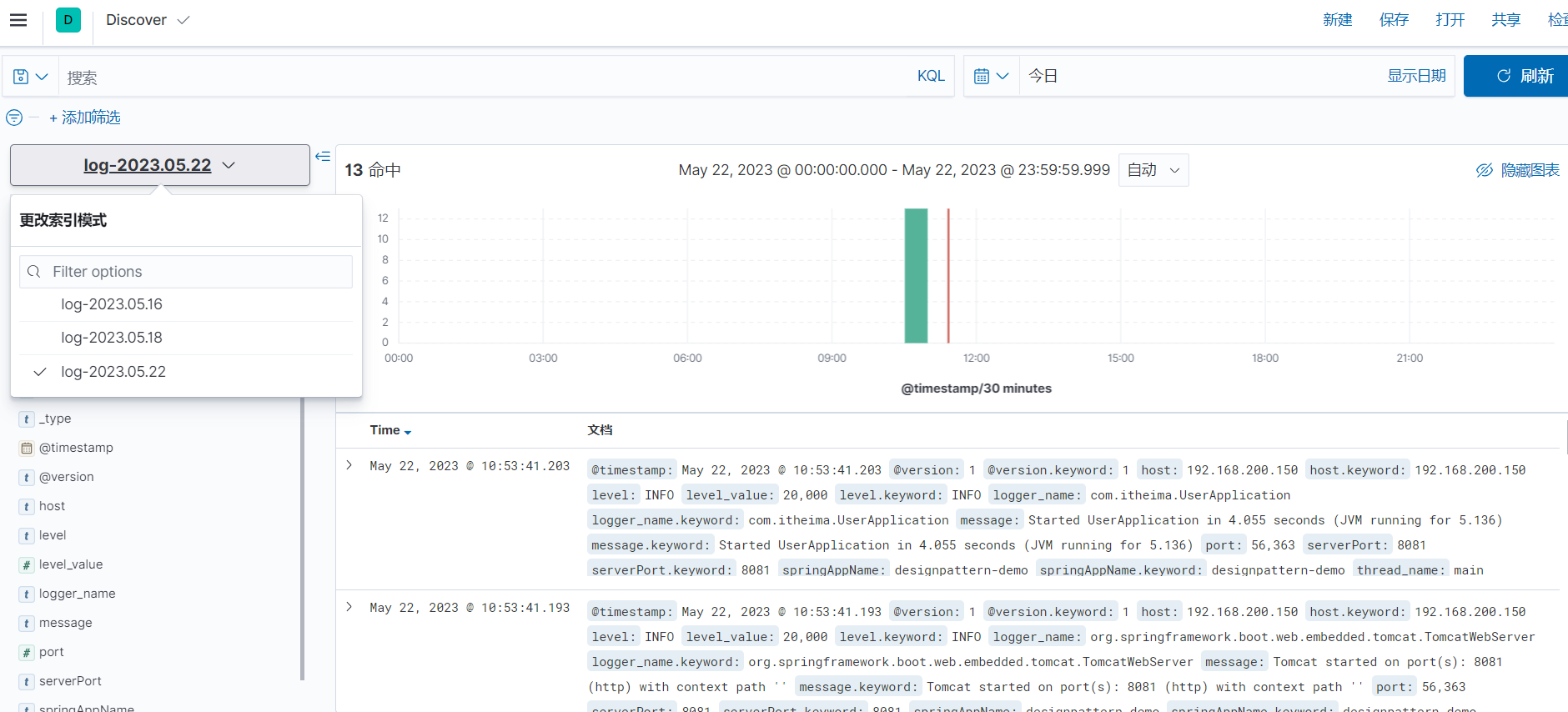 检索日志,选择不同的索引,可以按照不同的字段检索,或者在输入框直接输入内容,也是可以的
