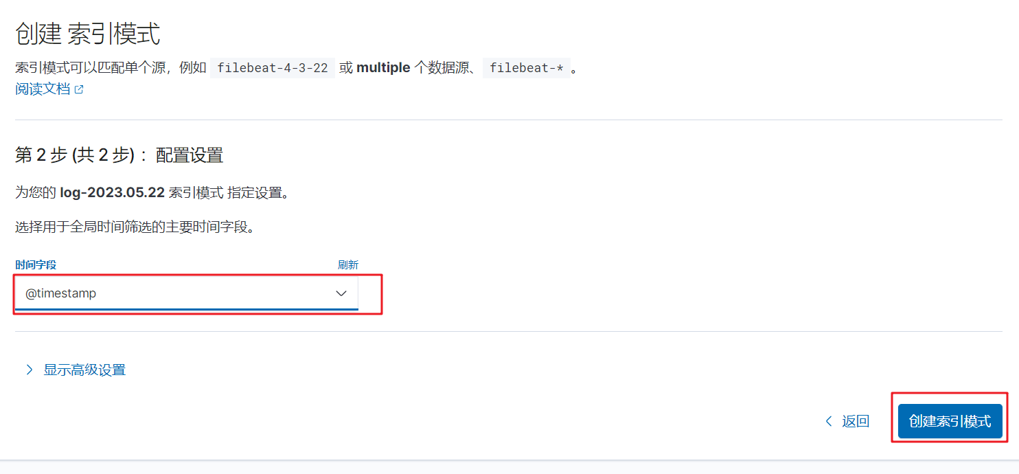 点击下一步,添加筛选的字段,一般都是时间戳字段,最后点击创建索引模式