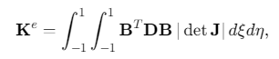 其中DDD为弹性矩阵(平面应力/应变)。高斯积分用于数值计算上述二重积分。