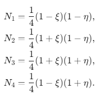 四节点四边形单元的自然坐标范围为ξ∈[−1,1],η∈[−1,1]ξ∈[-1,1],η∈[-1,1]ξ∈[−1,1],η∈[−1,1],形函数为双线性函数: