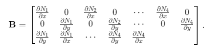 平面问题中,应变ε=[εx,εy,γxy]Tε=[ε_x,ε_y,γ_{xy}]^Tε=[εx,εy,γxy]T与位移u=[u,v]Tu=[u,v]^Tu=[u,v]T的关系为ε=Buε=Buε=Bu,其中BBB矩阵元素为: