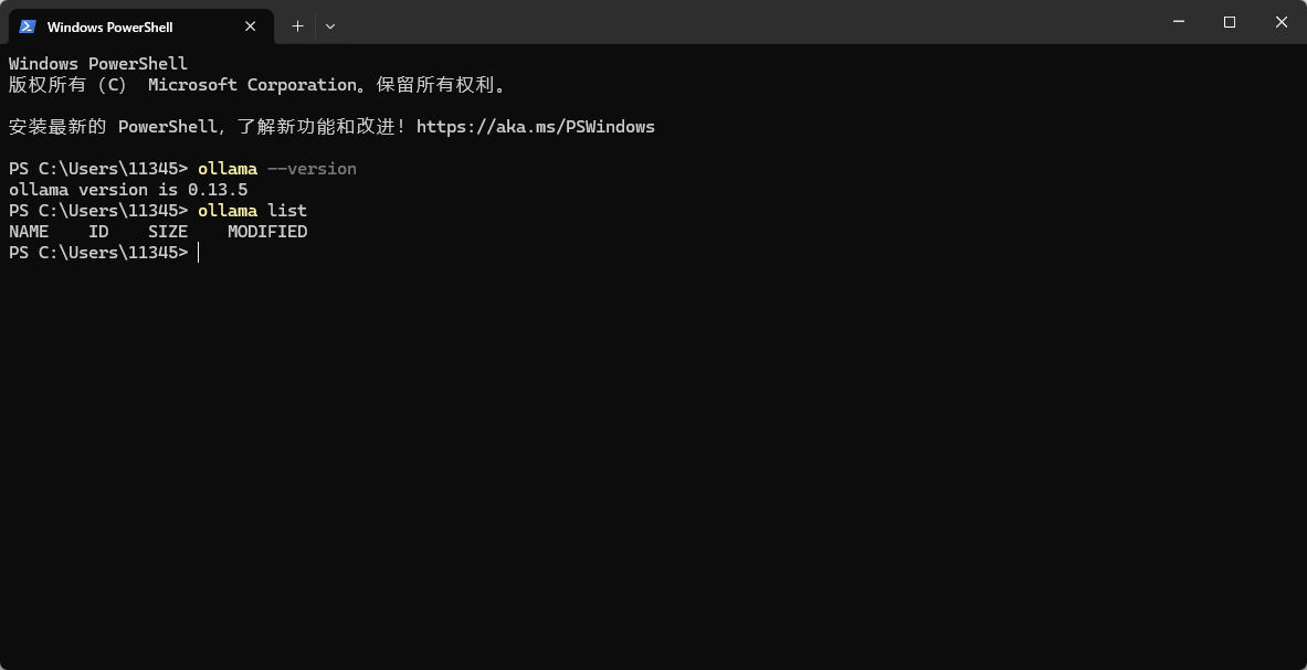 重启Ollama,打开终端输入ollama list,查看大模型资源包是否正常展示。ollama默认安装端口是11434