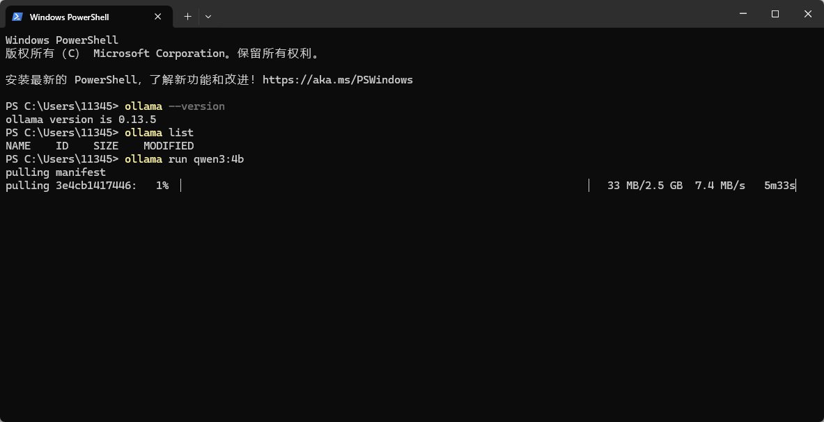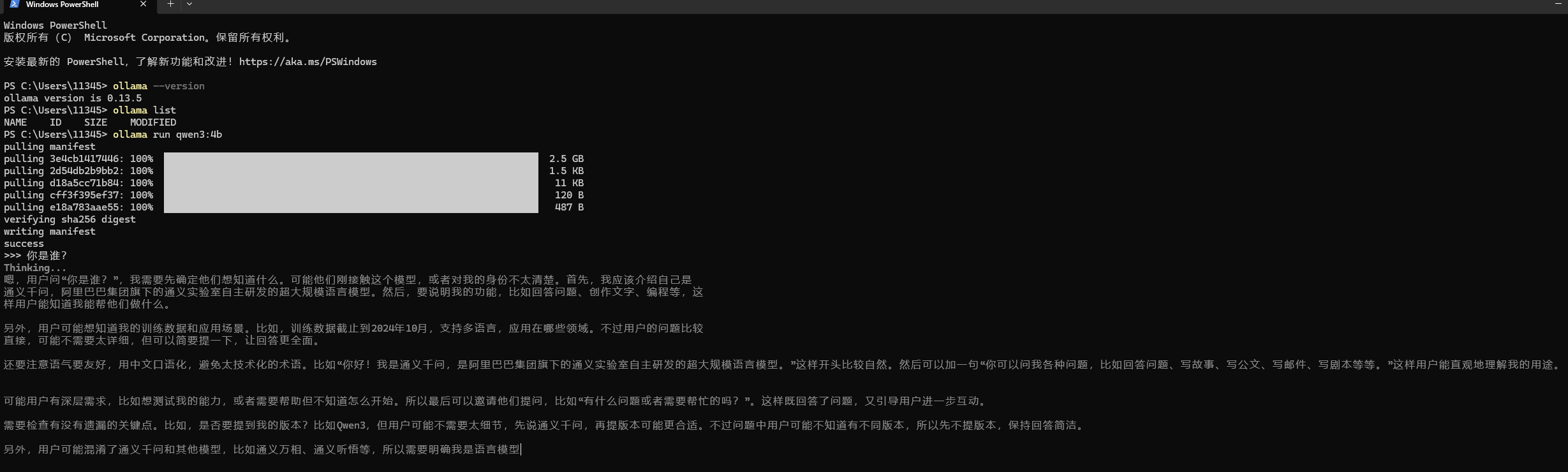 安装qwen3:4b试试水,终端里输入ollama run qwen3:4b