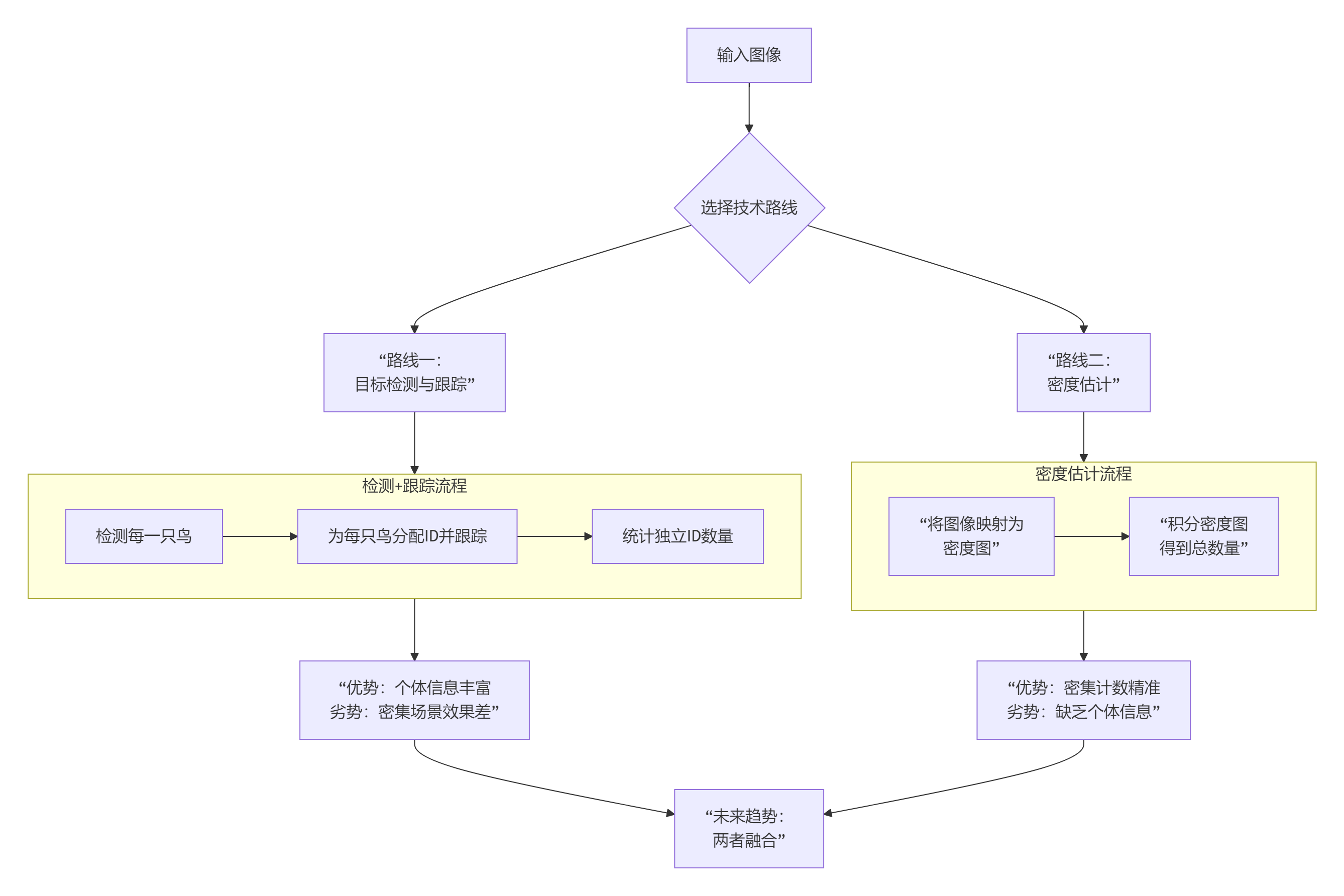 简单来说,当目标数量巨大时,逐一只进行"检测-识别-计数"的传统目标检测方法(如YOLO)会遇到瓶颈。目前主流的解决方案可以归结为两大技术路线,其核心原理对比如下: