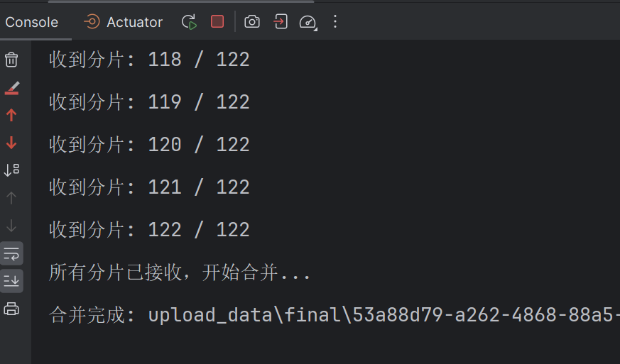 System.out.println("收到分片: " + chunkNumber + " / " + totalChunks);