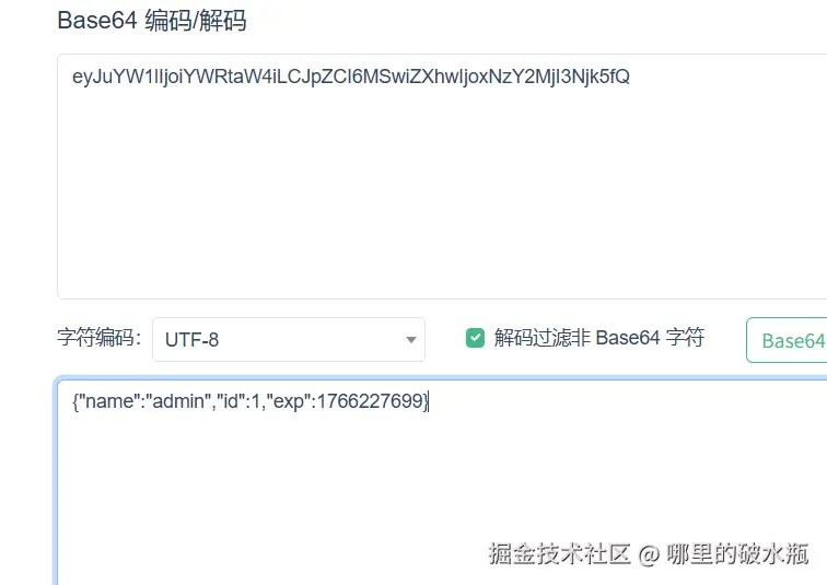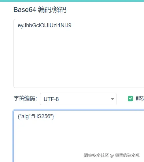 - 第一个部分,base64 解密是:{"alg":"HS256"}