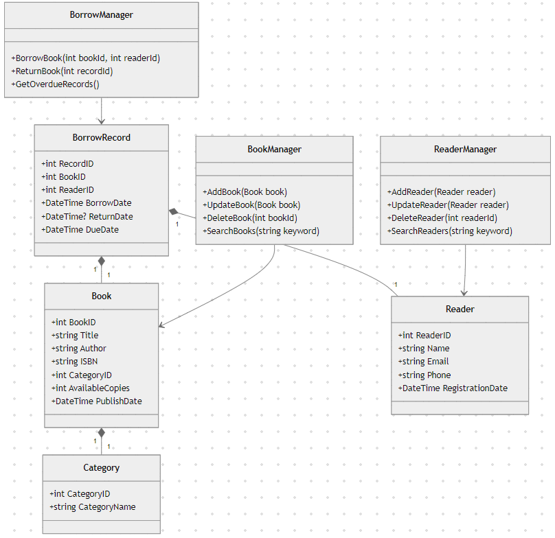 - 实体类(Book, Reader, BorrowRecord)封装数据