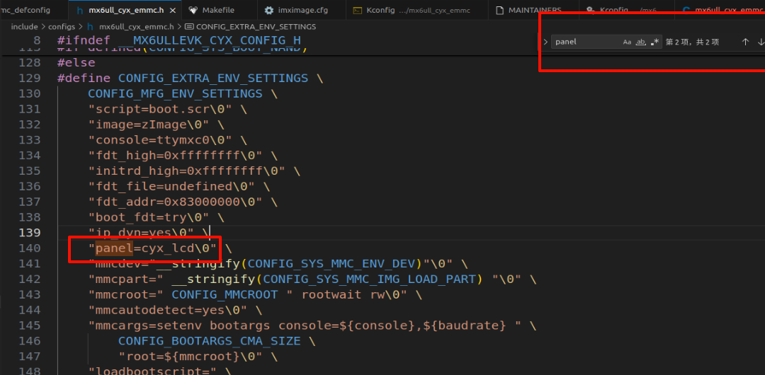3.如果你改了上边的name,那么为了让uboot找到这个参数的结构体,我们在头文件里,也就是include/configs/mx6ull_cyx_emmc.h,也就是上一章的拷贝的头文件。进入搜索panel,找到对应的修改。把这个填成和上边的一样的。