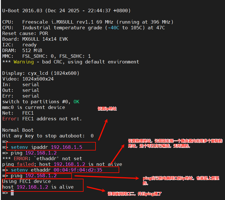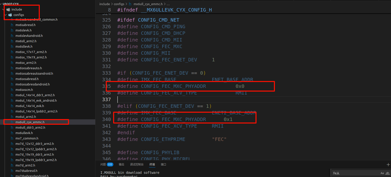 1.修改include下的板子的头文件里,这个网络的地址,这个是使用的正点原子板子,那么这里需要按照他pcb接线,这里地址分别为0和1,#define CONFIG_FEC_ENET_DEV 这个的值就是选择uboot启用哪一个网口,1就是使用网口二,0就是使用网口一。