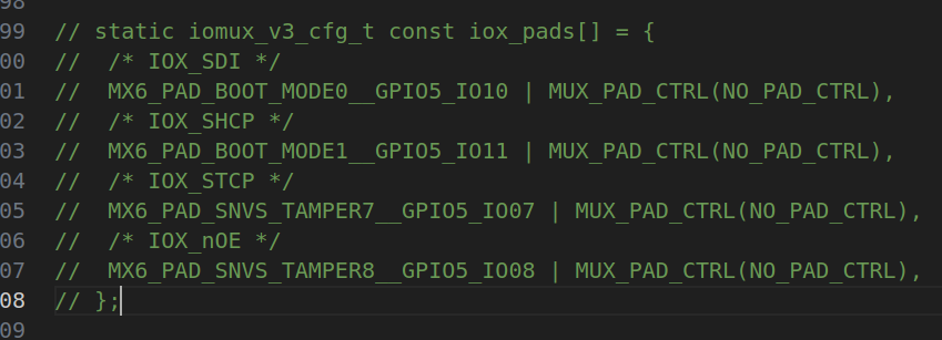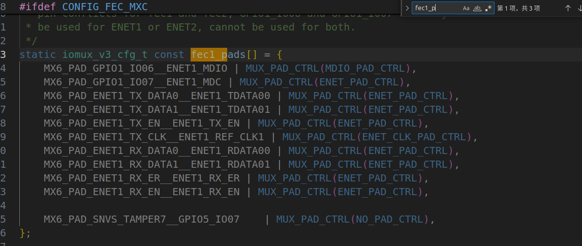 接着,搜索fec1_pads函数,在下边新增MX6_PAD_SNVS_TAMPER7__GPIO5_IO07 | MUX_PAD_CTRL(NO_PAD_CTRL),