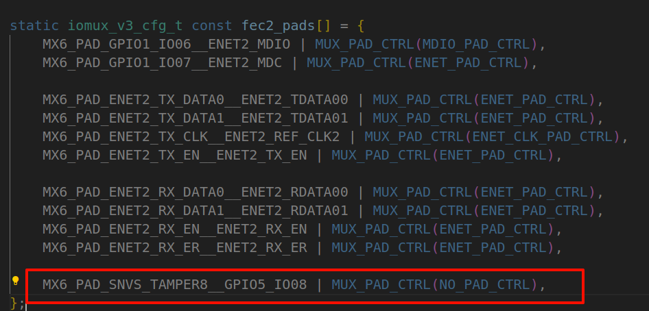 在fec2_pads下边增加MX6_PAD_SNVS_TAMPER8__GPIO5_IO08 | MUX_PAD_CTRL(NO_PAD_CTRL),
