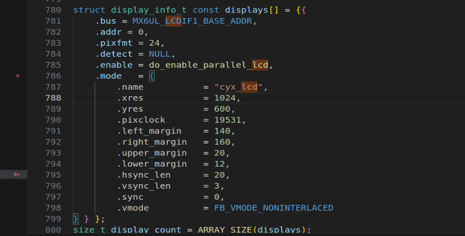 2.第二步是这里,主要是这个。这里的mode就是lcd参数的信息。我们根据自己的lcd来设置。我是七寸屏幕1024*600。所以,按照如下参数,这里的name是匹配用的,也是显示lcd的名字。可以改为自己喜欢的,比如我这里是cyx_lcd