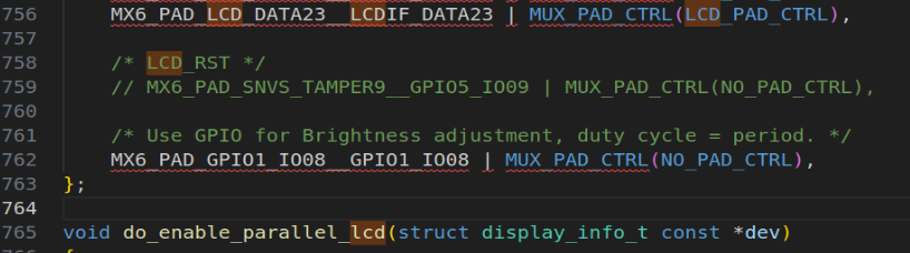 1.找到这个lcd_pads开始修改。上边是io部分,也就是引脚。我使用的正点原子7寸屏幕。他的引脚与nxp官方的evk开发板的屏幕的引脚是一样的。所以不需要修改。下边这个LCD_RST可以注释,因为正点原子的屏幕没有复位脚。