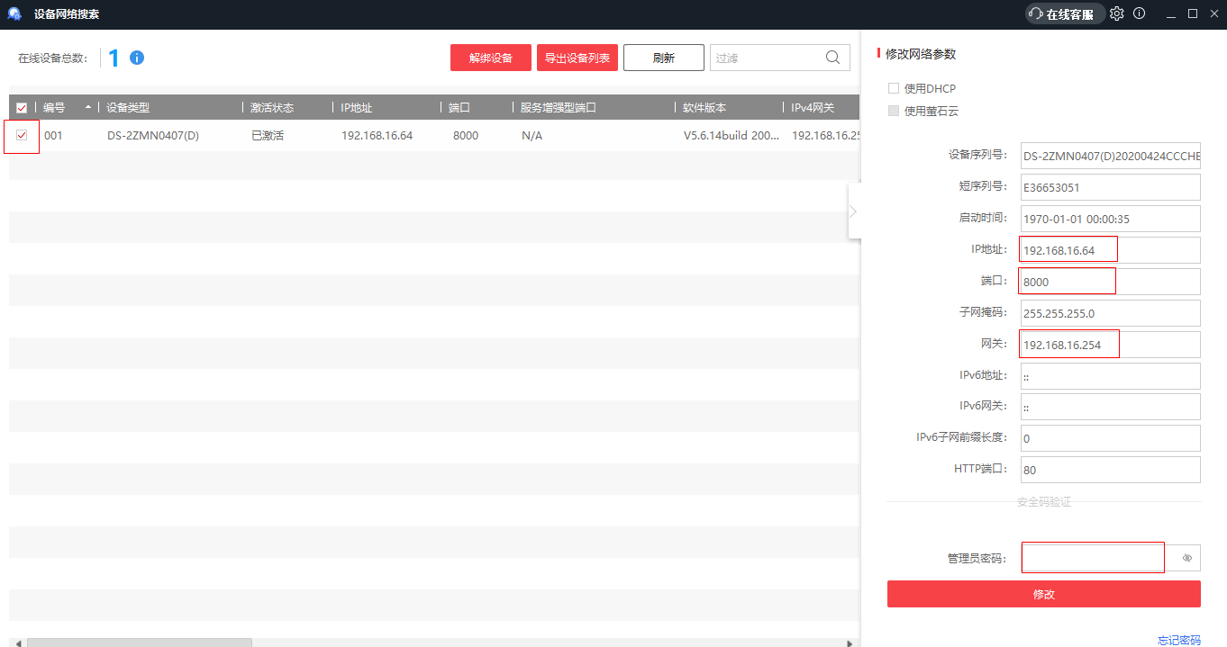 7、打开设备网络搜索工具,工具可以到官网下载。选中设备修改IP地址和网关,网关需要设置到局域网的同一个网段内,比如:192.168.16.1。然后输入密码,即激活生效。