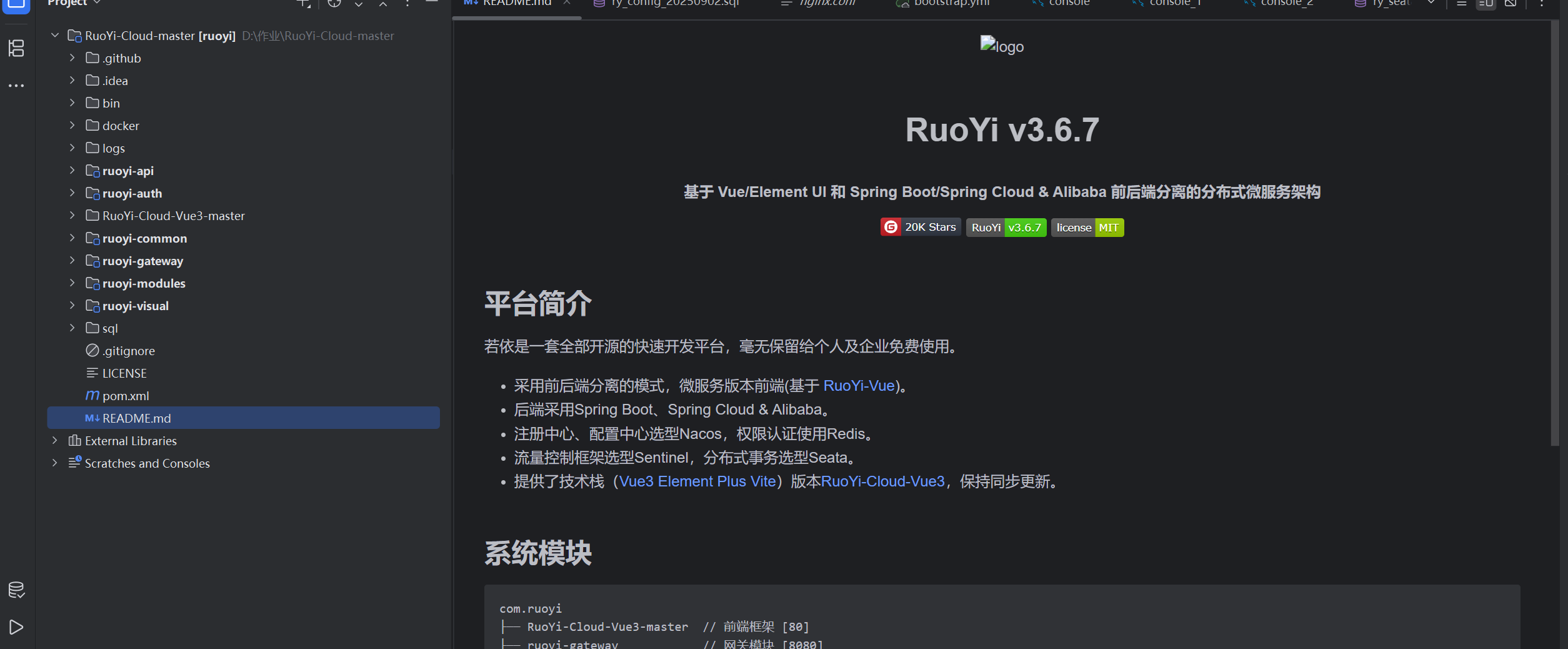 获取好项目如下,需要注意的点是我这个是把后端里面的ruoyi-ui删除了这个是vue2的然后现在下载了vue3版本的前端是RuoYi-Cloud-Vue3: