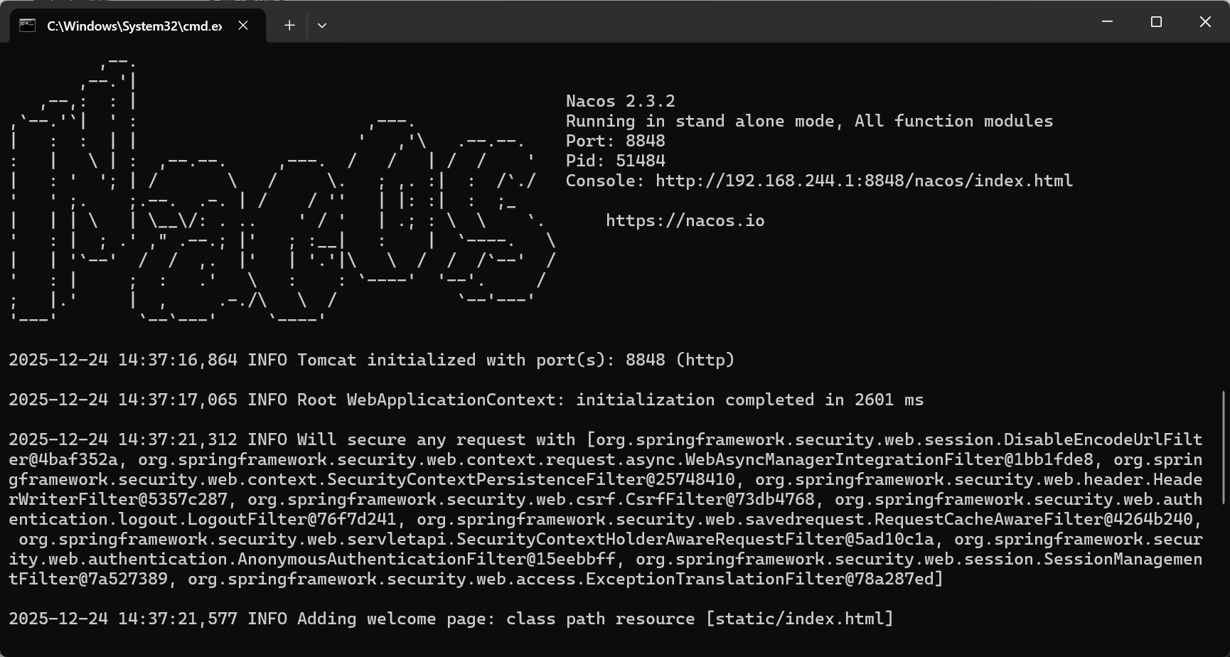 访问控制台:http://127.0.0.1:8848/nacos,默认账号/密码:nacos/nacos,能登录即启动成功。