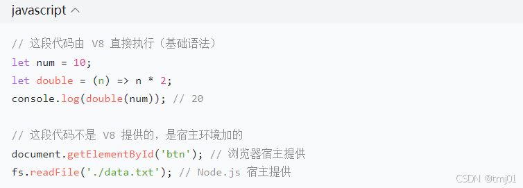 - V8只处理JS本身,DOM(前端)、fs/http(后端)是宿主环境附加的能力,不是V8的功能