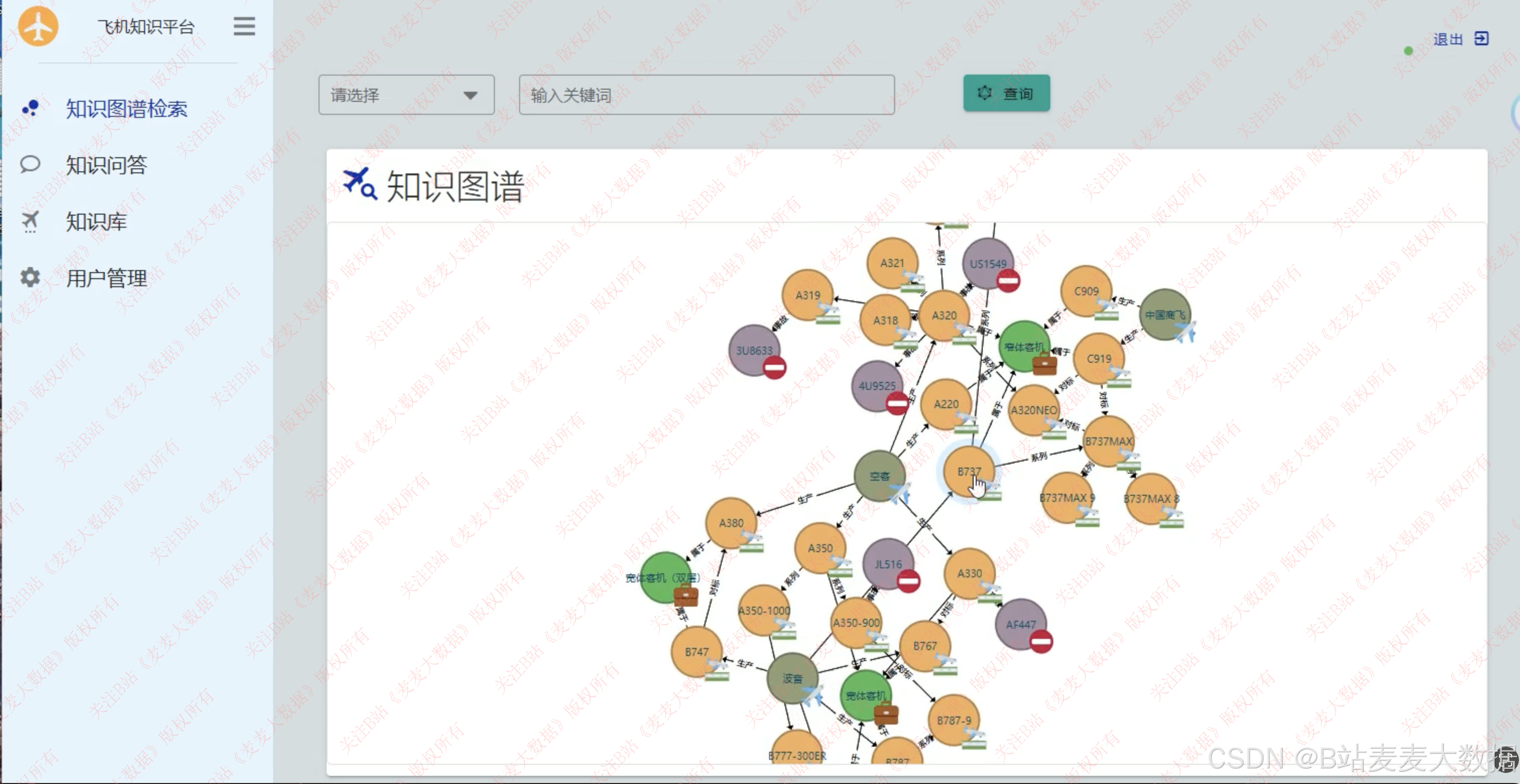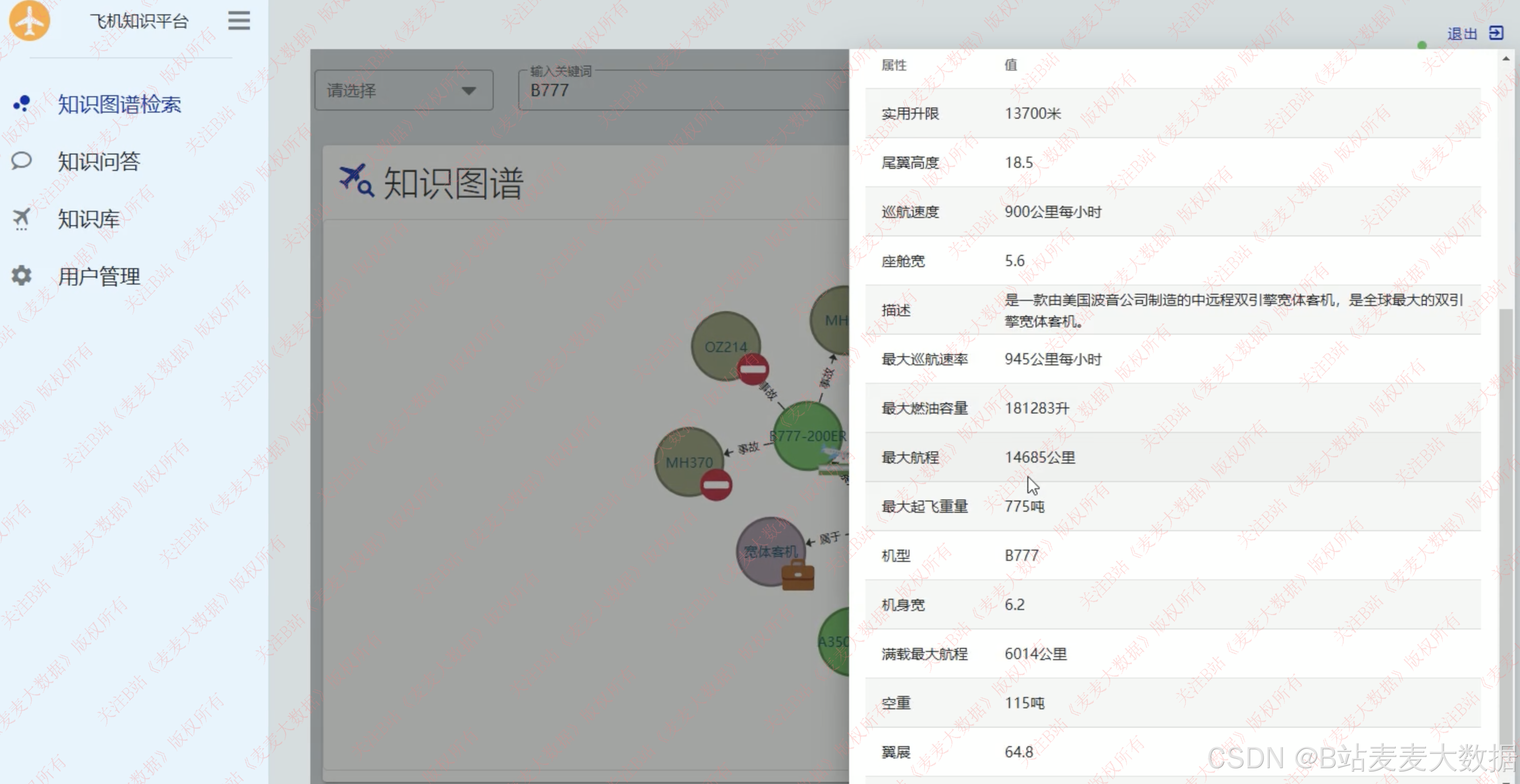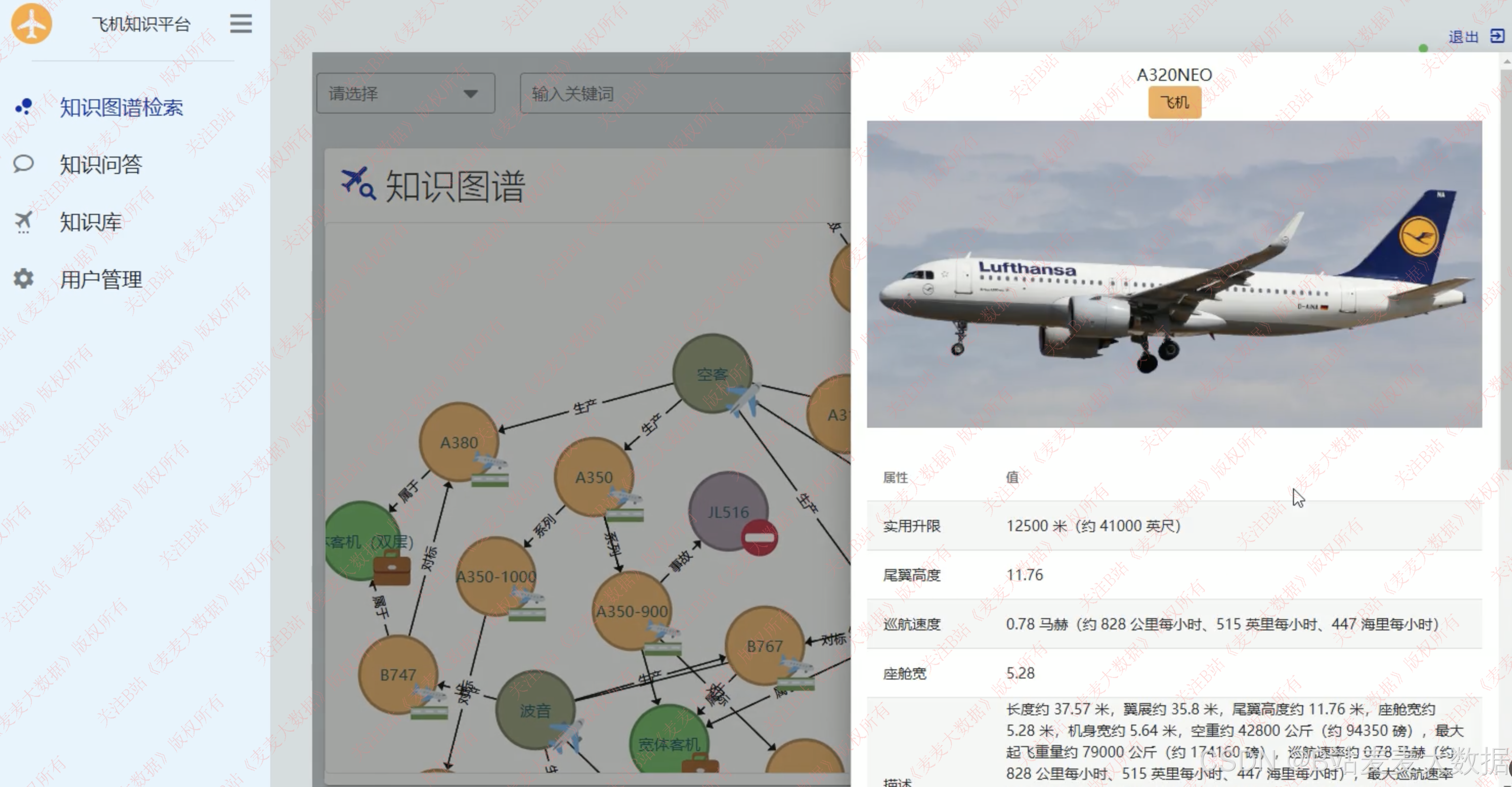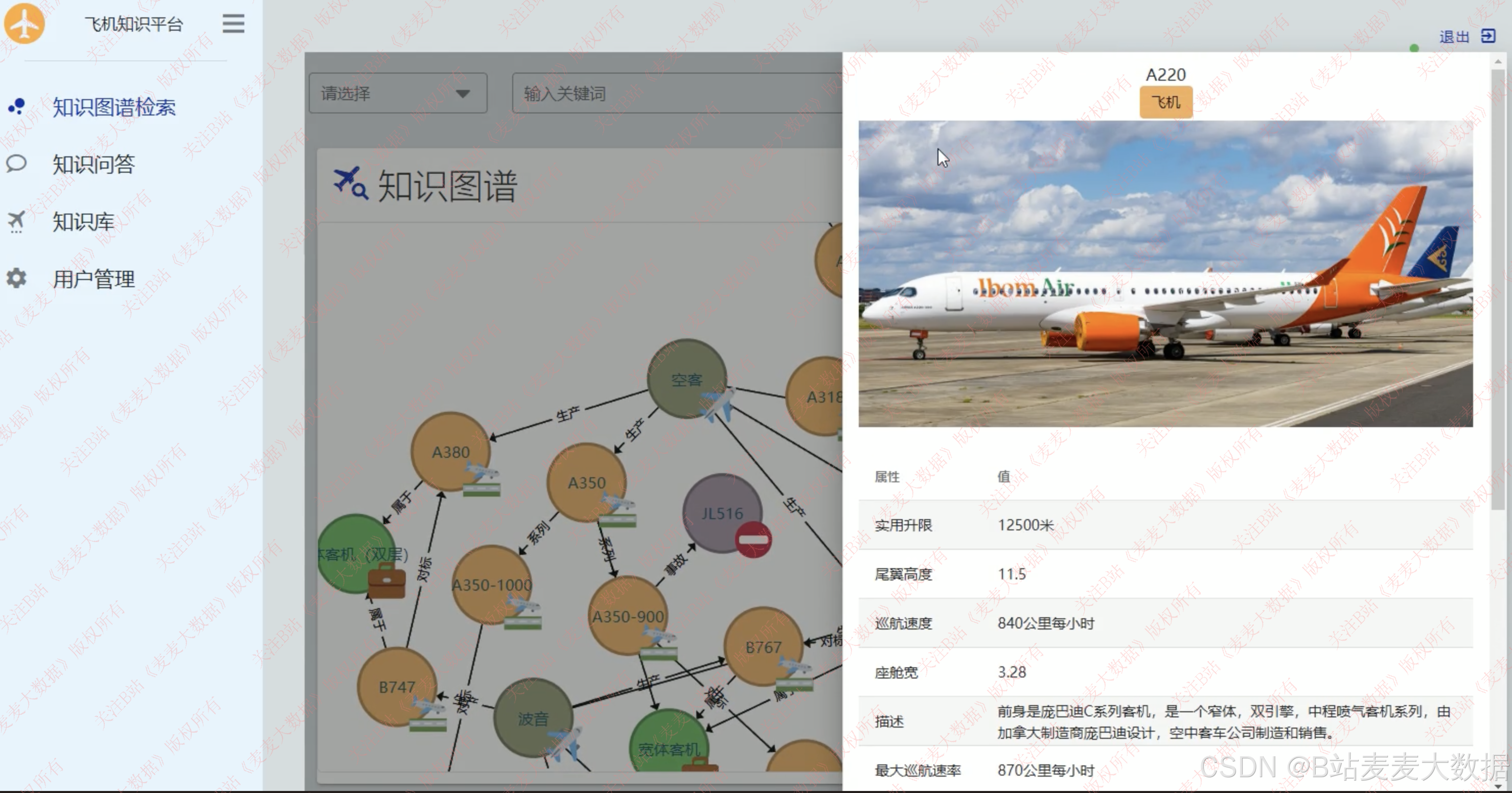 d3.zoom()) 实现图谱的放大、缩小和拖动功能。 - 节点交互: 用户点击某个节点时,D3.js 会触发相应的交互效果。例如,点击飞机型号时,右侧会展示该飞机的详细信息(如照片、属性等)。