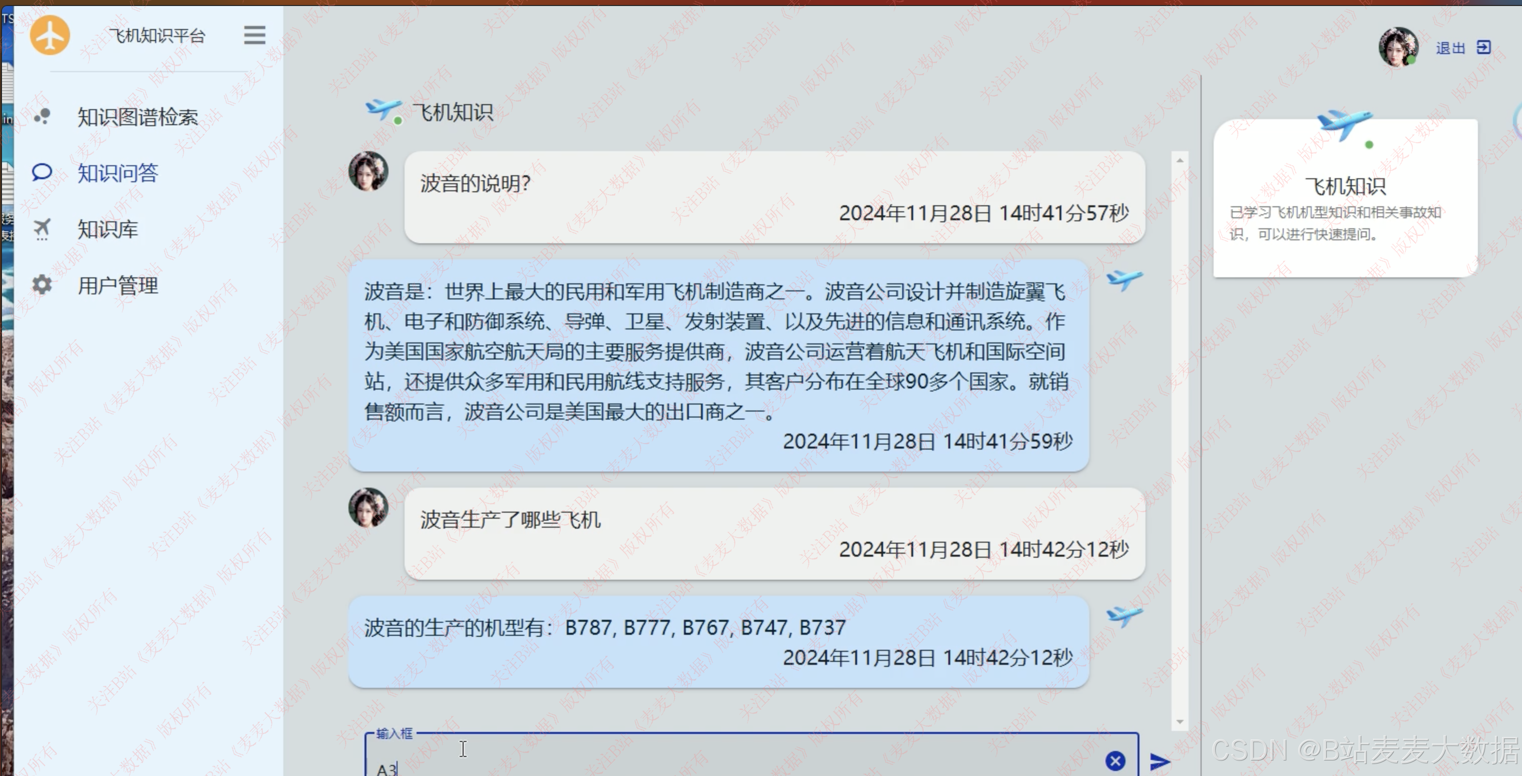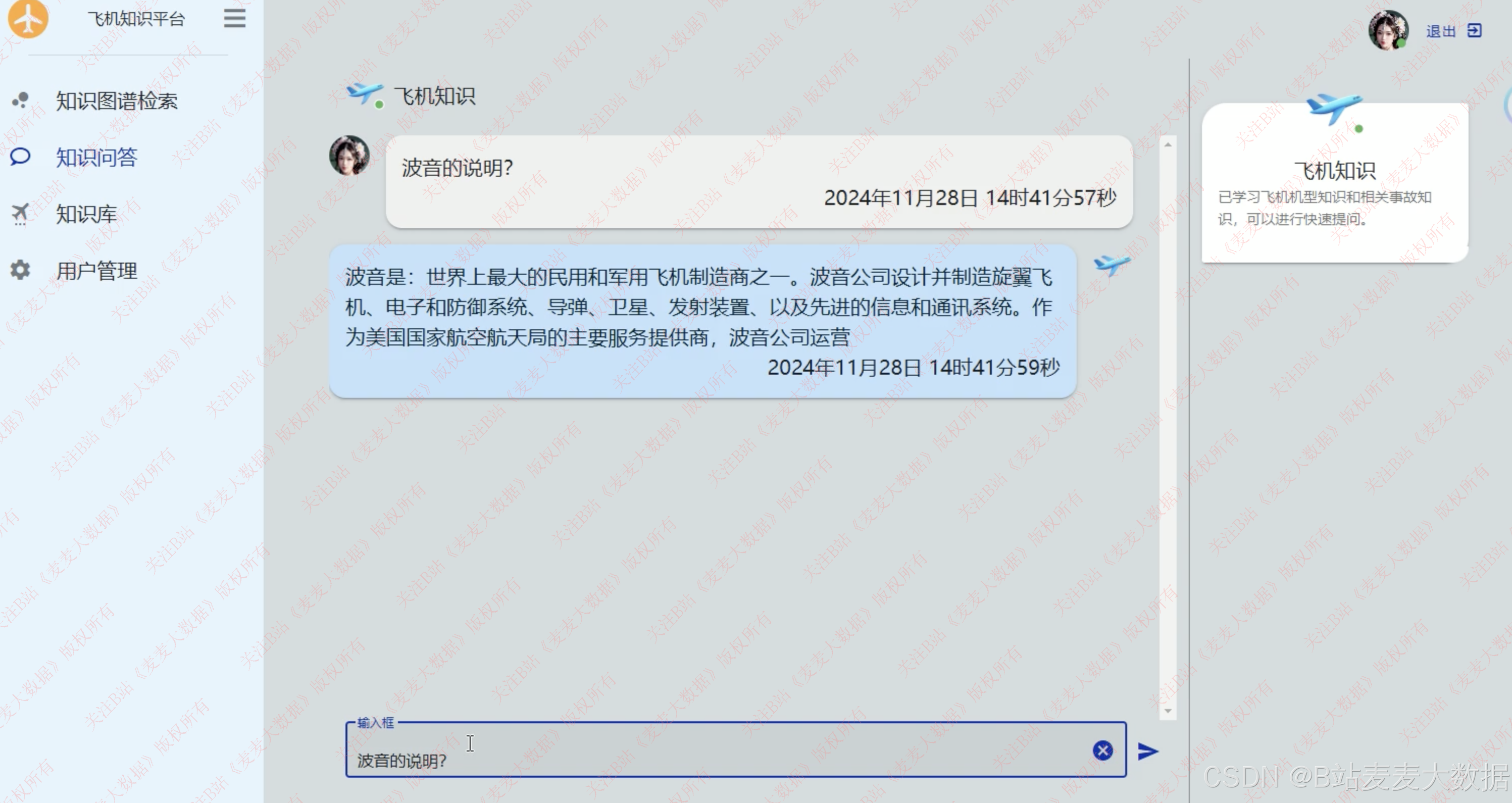 - 用户通过前端界面输入自然语言问题。例如,"某型号飞机的xxx属性?"。
