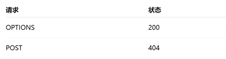 实际上,预检(OPTIONS) 200 并不代表接口存在,POST 404表示后端没有这个路径,或者说路径不在这个server上。也就是说,跨域是通的,但接口地址是错的/不存在。
