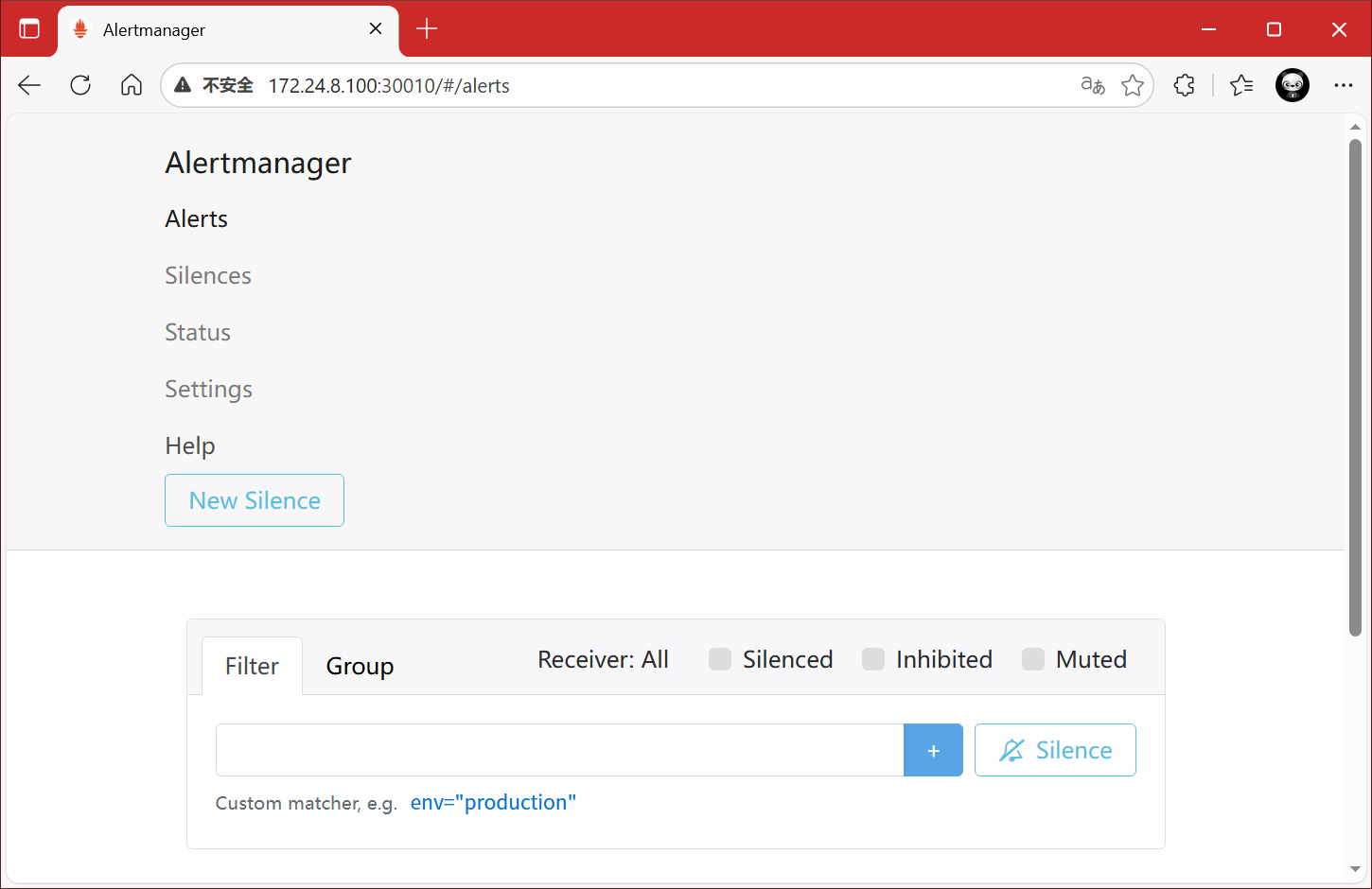 访问alertmanager,http://172.24.8.100:30010/ 。