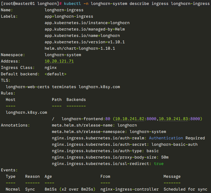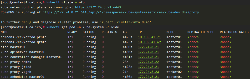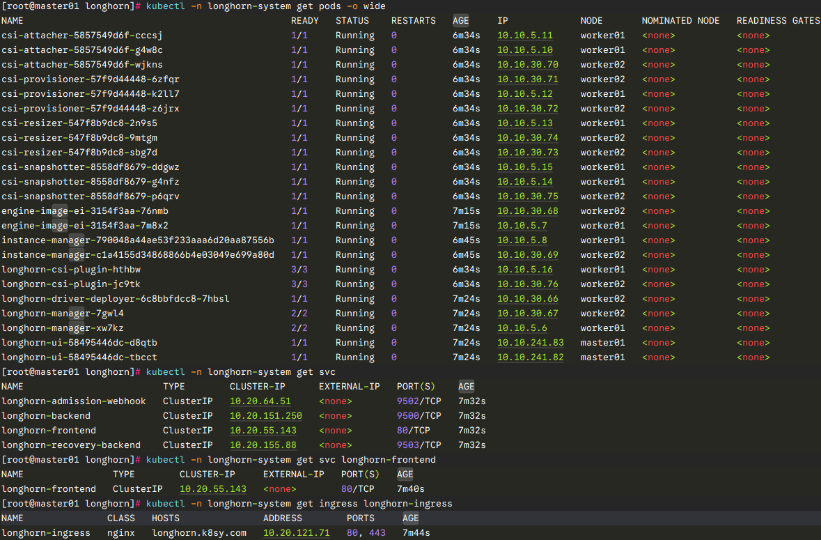| master01 | 172.24.8.21 | Kubernetes master节点 | kubeadm、kubelet、kubectl、KeepAlived、HAProxy、containerd、etcd、kube-apiserver、kube-scheduler、kube-controller-manager、calico、WebUI、metrics、ingress、Longhorn ui节点 |