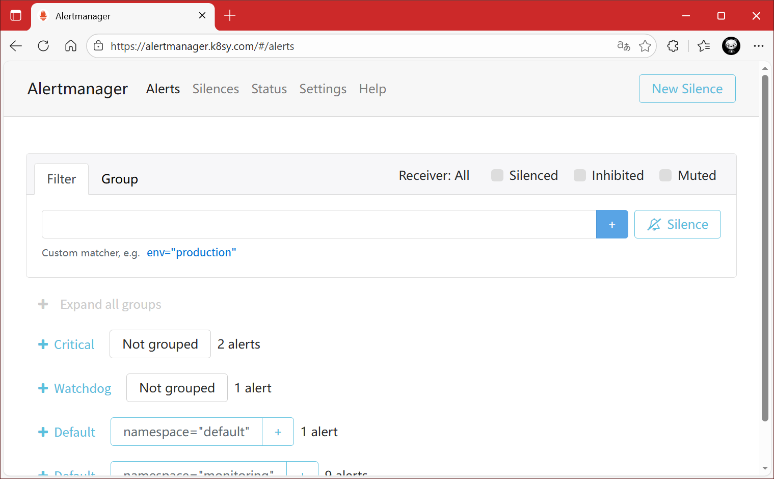 访问 alertmanager,https://alertmanager.k8sy.com 。