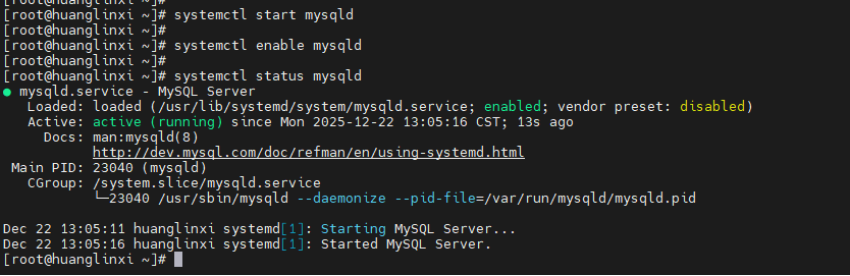 systemctl status mysqld验证服务状态为"active (running)"。 -