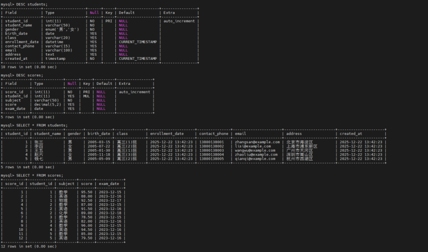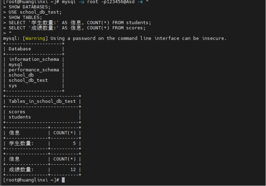 mysql -u school_admin -p -e "USE school_db; SELECT COUNT(*) as 学生数量 FROM students; SELECT COUNT(*) as 成绩记录数 FROM scores;"