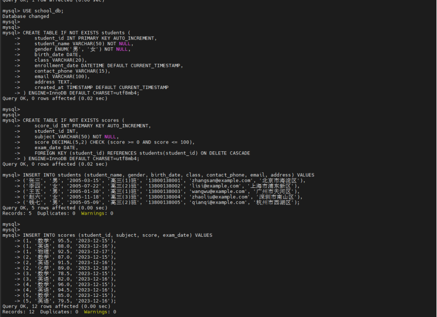 mysql -u school_admin -p school_db < students.sql- 导入SQL文件mysqldump -u school_admin -p school_db > backup.sql- 备份数据库mysqlcheck -u school_admin -p school_db --auto-repair- 检查并修复表