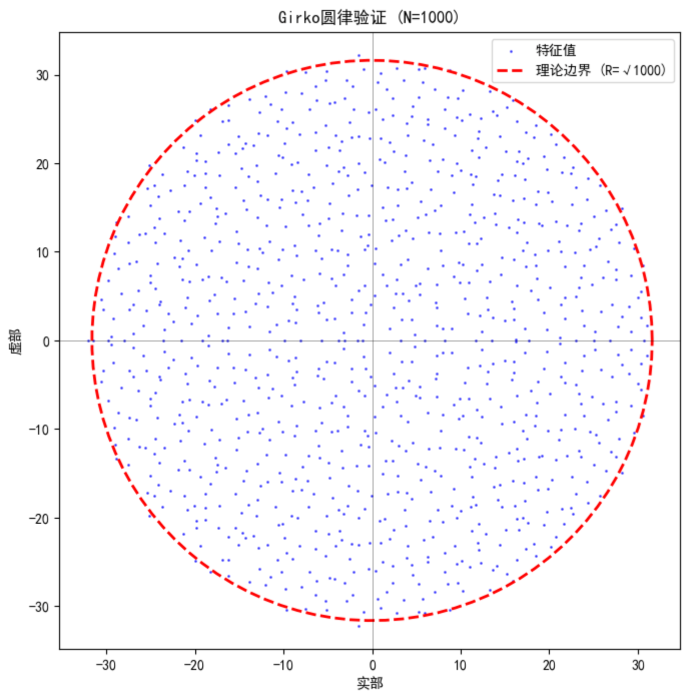 - 分布范围 :这些特征值散落在复平面原点附近。如果这是一个更大规模(如1000×1000)的标准高斯随机矩阵 (元素来自N(0,1)),其特征值通常会近似分布在以原点为圆心、半径约为√n的圆盘内------这就是著名的 Girko圆律(或Circular Law)的体现。