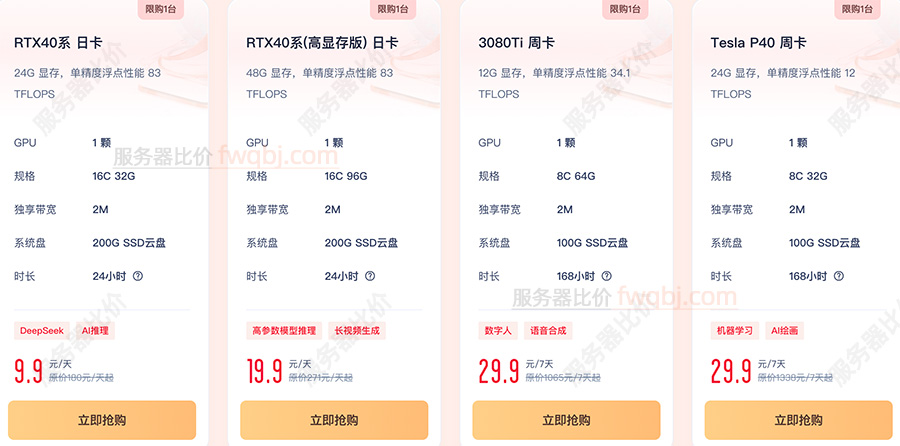 UCloud云服务器GPU显卡RTX40、3080Ti和Tesla P40费用表,低至9.9元起,云服务器吧yunfuwuqiba.com整理UCloud优刻得GPU云服务器详细配置及费用: