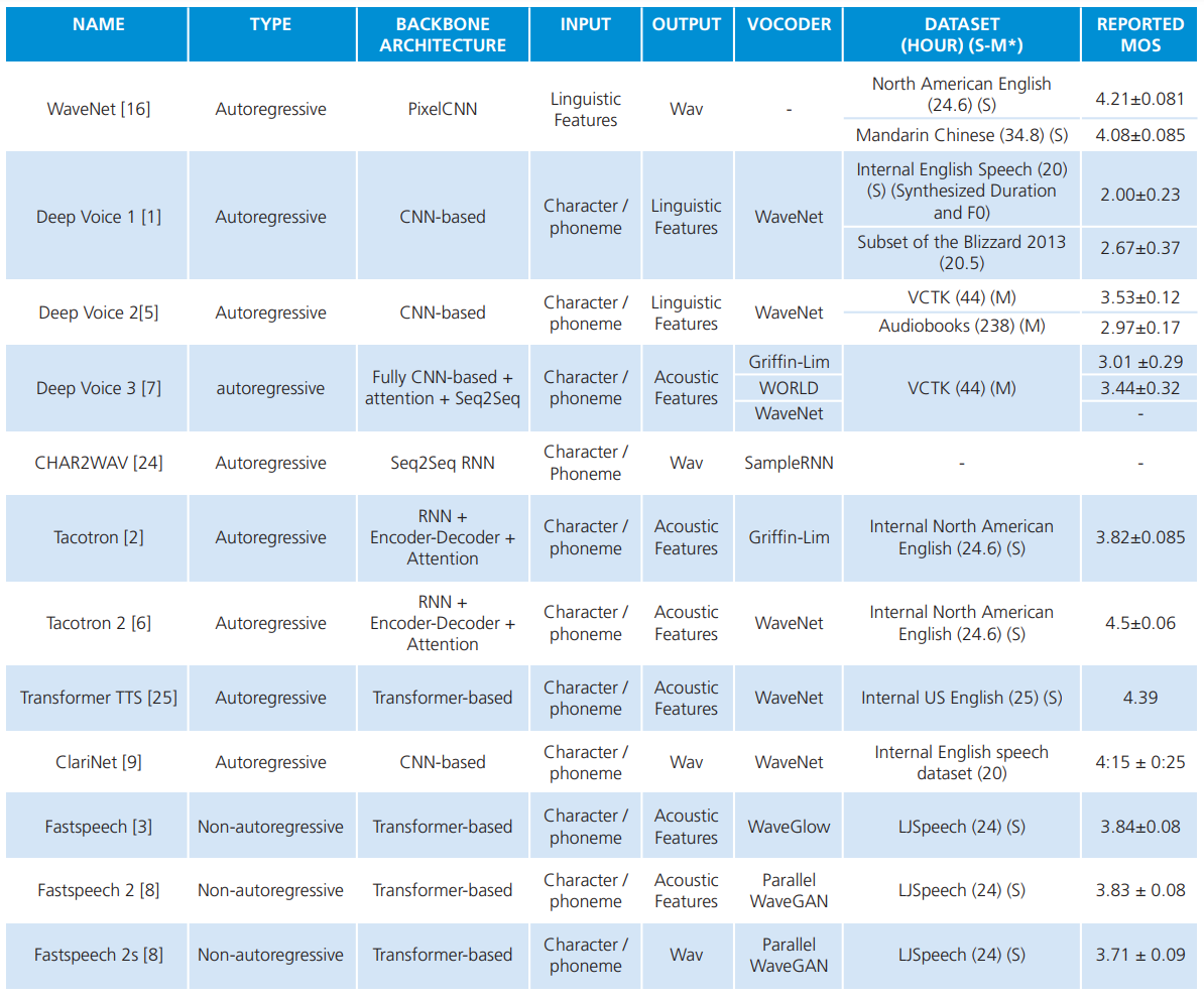 表3汇总了当时最先进的TTS系统。据此,Tacotron 2、Transformer TTS、WaveNet、FastSpeech 1和ClariNet是当时最成功的TTS系统。