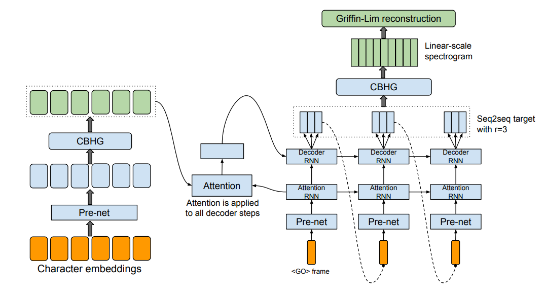Tacotron是一种端到端的生成式文本到语音模型,能够直接从字符合成语音。Tacotron采用序列到序列架构,从字符序列生成幅度谱图,用单一神经网络取代了传统的语言学和声学特征处理流程。