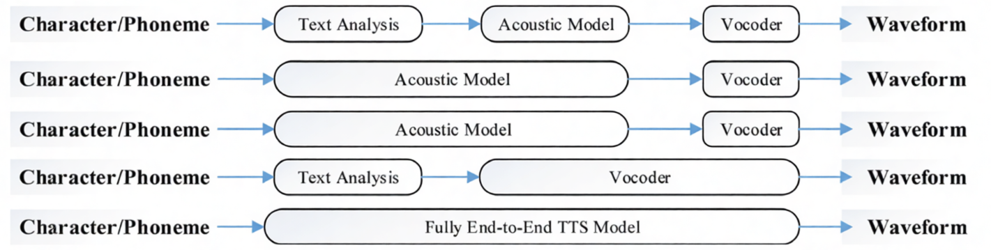 基础端到端结构是由独立训练的分离模块组合连接而成的端到端系统,如Deep Voice;