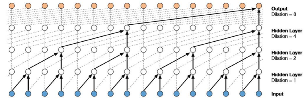 受图像生成自回归模型启发,WaveNet首次解决了高保真原始音频波形生成 问题(采样率≥16kHz)。其核心创新在于采用膨胀因果卷积(Dilated Causal Convolution) 克服长时序依赖建模难题。