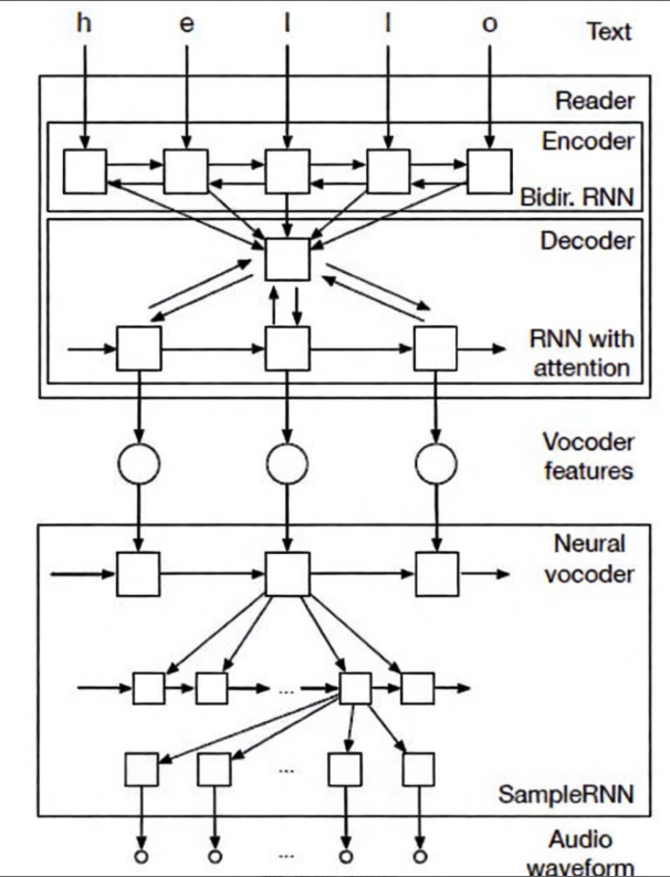 Char2Wav将文本到语音模型的建模分为两个部分:一个读取器(前端)和一个神经声码器(后端)。