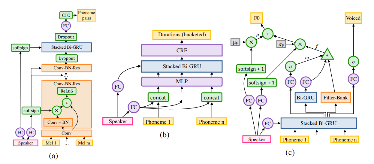 输出层:一是音素时长、二是音素为浊音的概率(浊音就是有声带振动的音,如元音;无声带振动的音如"s"、"sh"就没有基频)、三是在预测时长内均匀采样的基频(F0)。