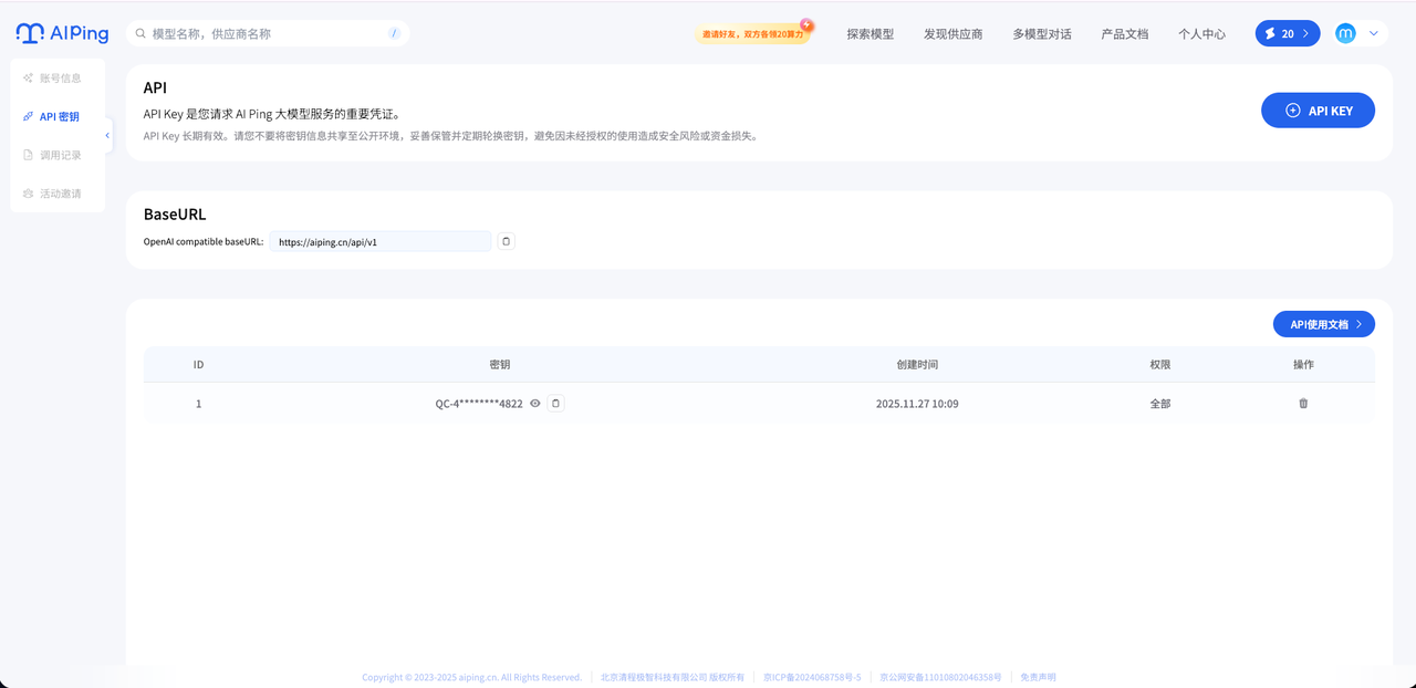 - API Key:填写用户的 api-key(登录 AI Ping 官网 https://aiping.cn 获取)