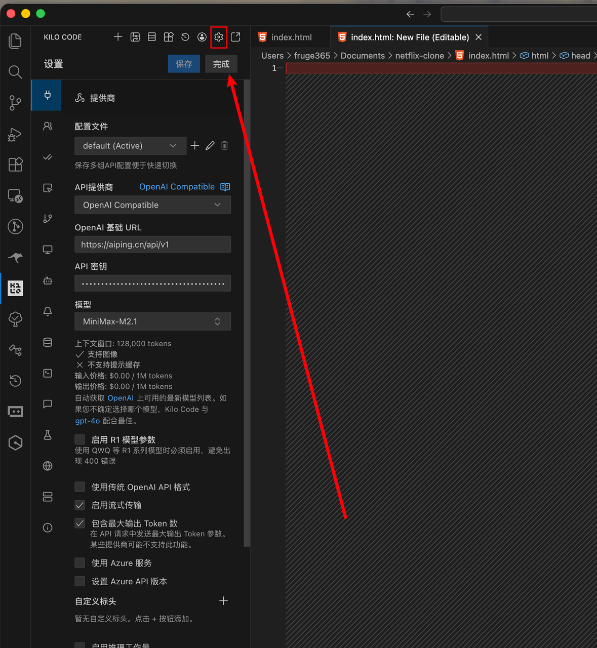打开设置:点击"设置"(齿轮图标),进入 roo code 插件设置页面: