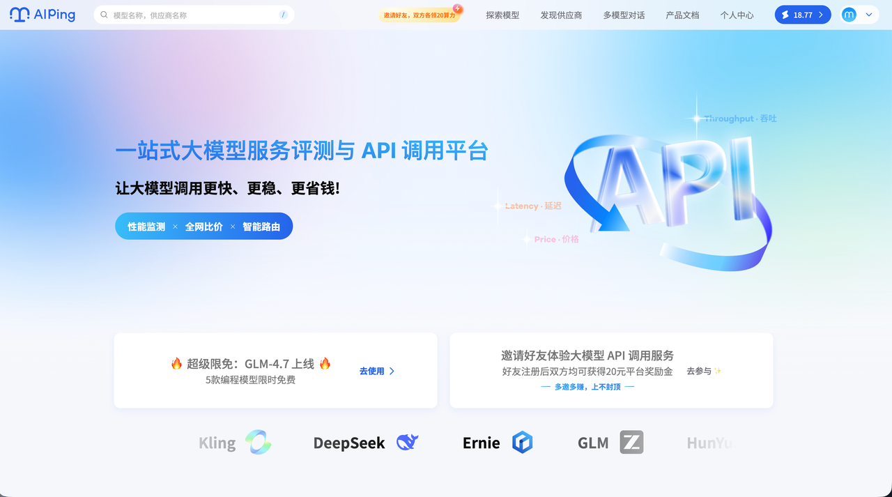 在大模型应用爆发的当下,开发者常面临"选模型难、调接口繁、控成本贵"的三重困境------想对比不同模型性能却缺乏实时数据,要集成多个API却陷入碎片化开发,刚上手调用又担心资源超支。而AI Ping (官网:https://www.aiping.cn/ )的出现,恰好为这些痛点提供了一站式解决方案,更带来了MiniMax-M2.1、GLM-4.7等热门模型的免费使用权益。本文将从平台介绍、模型解析、实操指引到价值总结,带您全面掌握这一AI开发利器。