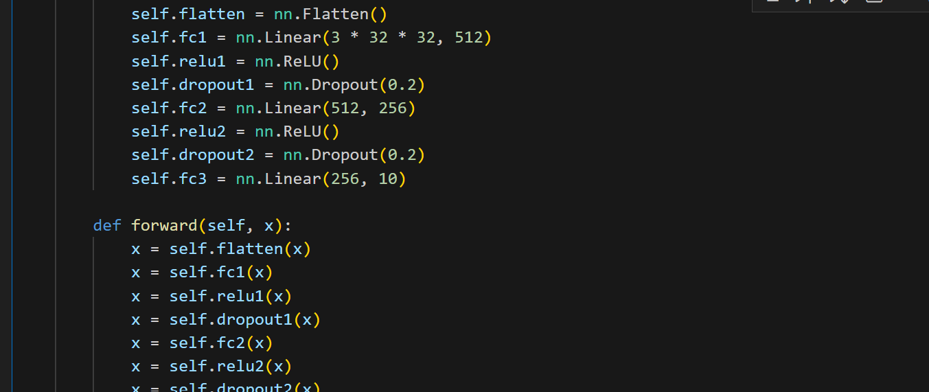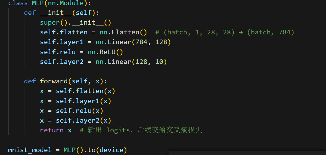 模型:展平 28×28 图像,堆叠线性层 + ReLU 得到 logits。
