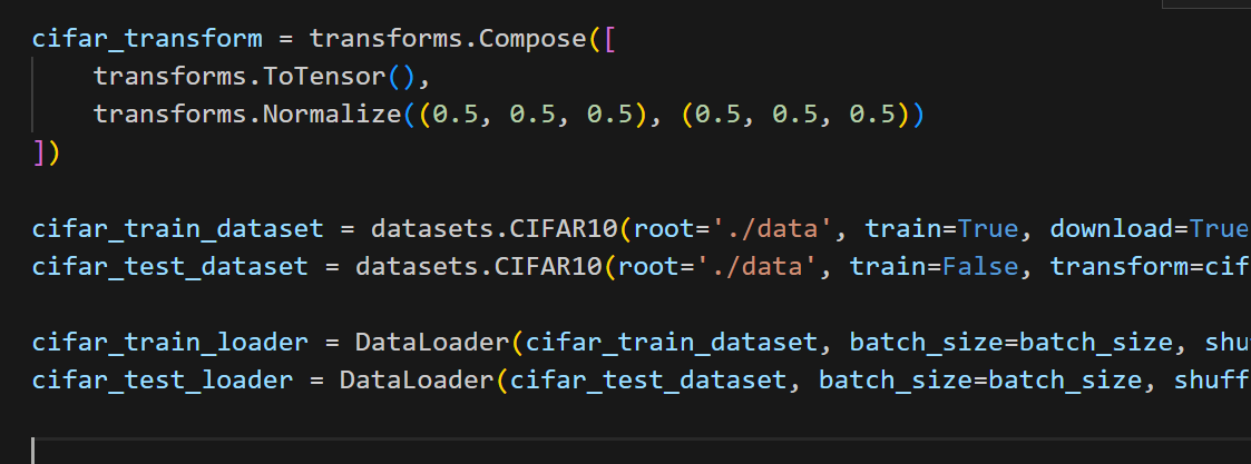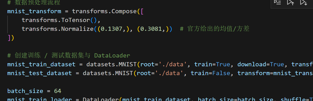 数据准备:transform → datasets.MNIST → DataLoader,按批处理。