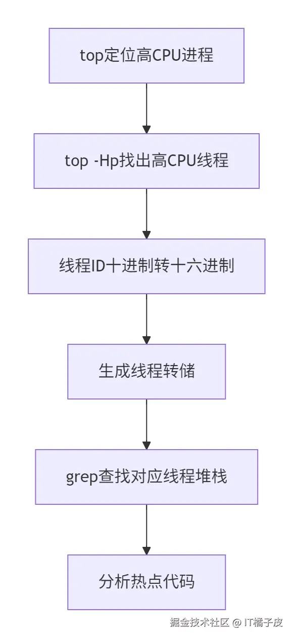 CPU使用率过高通常由死循环或密集计算引起。排查流程如下: